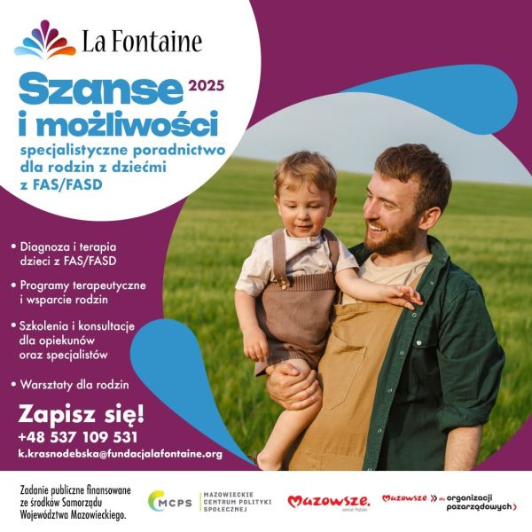 W imieniu Fundacji La Fontaine uprzejmie informujemy o możliwości skorzystania z bezpłatnego wsparcia w ramach projektu „Szanse i możliwości – specjalistyczne poradnictwo dla rodzin z dziećmi z FAS/FASD”, realizowanego w 2025 roku.