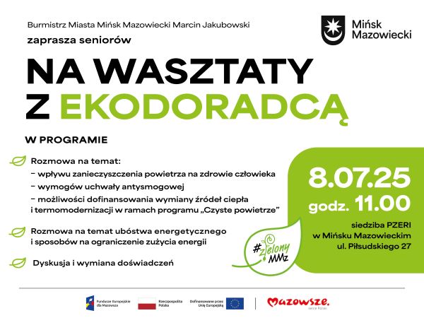 8 lipca 2025 r. godz. 11.00 Burmistrz Miasta Mińsk Mazowiecki Marcin Jakubowski zaprasza seniorów na „Warsztaty z Ekodoradcą” w siedzibie PZERI w Mińsku Mazowieckim, ul. Piłsudskiego 27.