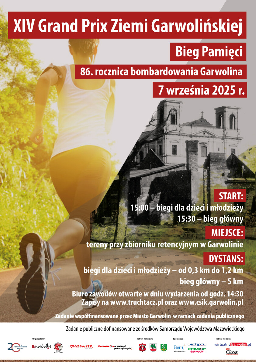 Najbliższy, trzeci bieg w ramach XIV Grand Prix Ziemi Garwolińskiej odbędzie się 7 września. Wyjątkowy nie jest tylko czas zawodów, ale także ich idea. Zawodnicy wezmą udział w Biegu Pamięci, który ma przypominać o wydarzeniach z czasów II wojny światowej, a w szczególności bombardowaniu Garwolina.