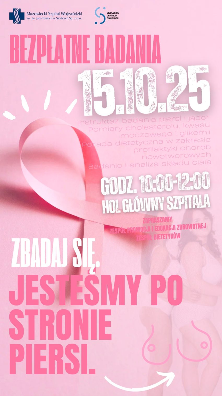 Już jutro w godzinach 10-12 w holu głównym siedleckiego szpitala (Mazowiecki Szpital Wojewódzki im św Jana Pawła II w Siedlcach) zaprasza na bezpłatne badania profilaktyczne z okazji Różowego Października!