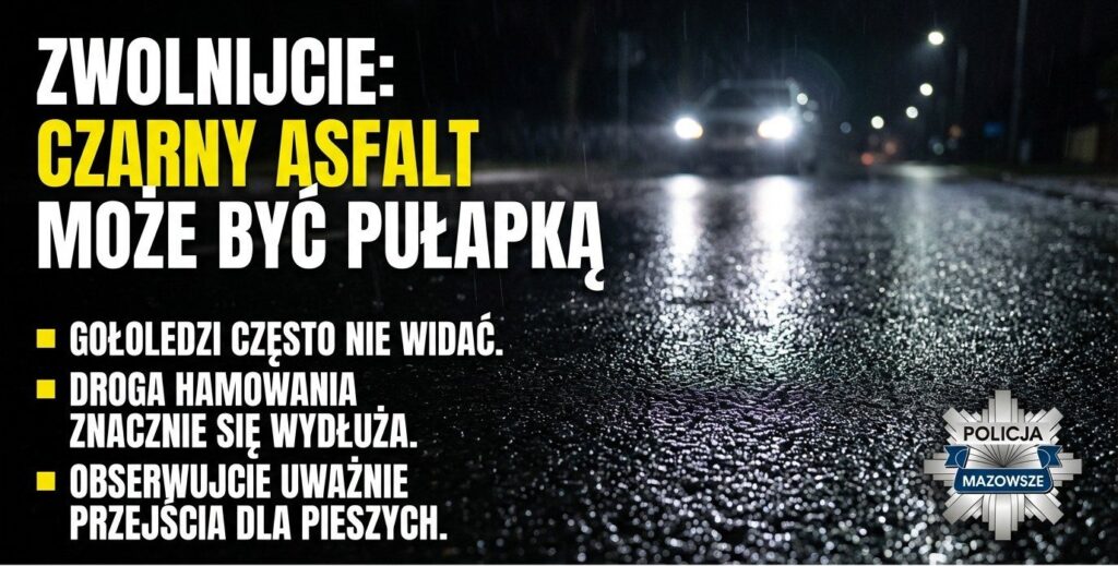 Szklanka na drogach: Nawierzchnia może wyglądać na mokrą, a w rzeczywistości jest pokryta warstwą lodu.