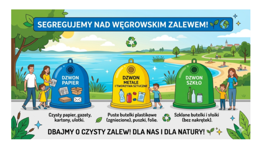 Miasto Węgrów chce, aby węgrowski zalew był miejscem nie tylko pięknego wypoczynku, ale i dbałości o naturę. Aby ułatwić Państwu dbanie o porządek podczas spacerów i rekreacji, nad brzegiem ustawiono trzy nowe pojemniki typu „dzwon” do segregacji odpadów.