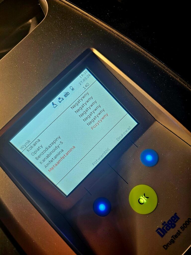 Podczas legitymowania policjanci sprawdzili stan trzeźwości kierującego. Badanie wykazało, że był trzeźwy. Z uwagi jednak na podejrzenie, że 37 – latek znajduje się pod wpływem środków odurzających, funkcjonariusze wykonali test na obecność w organizmie narkotyków. Badanie dało wynik pozytywny w kierunku metamfetaminy.