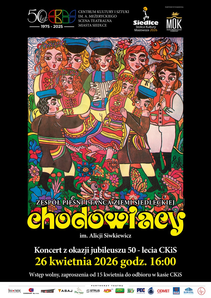 W niedzielę, 26 kwietnia 2026 roku o godz. 16:00 w Centrum Kultury i Sztuki im. Andrzeja Meżeryckiego odbędzie się koncert Zespołu Pieśni i Tańca Ziemi Siedleckiej „Chodowiacy” im. A. Siwkiewicz. Wydarzenie stanowi jeden z ważnych punktów obchodów 50-lecia działalności instytucji, z którą zespół był związany nieprzerwanie przez 35 lat.