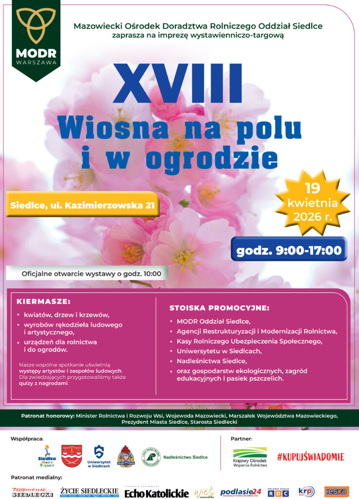 Już dzisiaj (19.04) na terenie Mazowieckiego Ośrodka Doradztwa Rolniczego w Siedlcach odbędzie się VIII edycja „Wiosny na polu i w ogrodzie”.